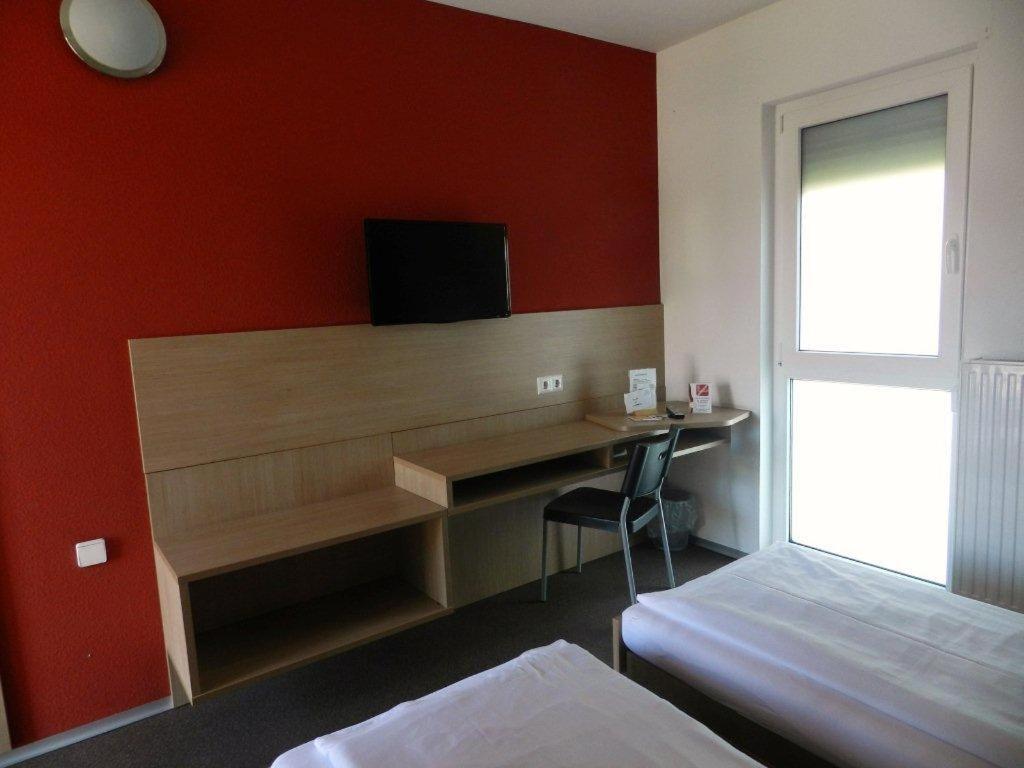 The functionally furnished rooms at the Angern Motel feature a work desk, satellite TV, and a bathroom with hairdryer.