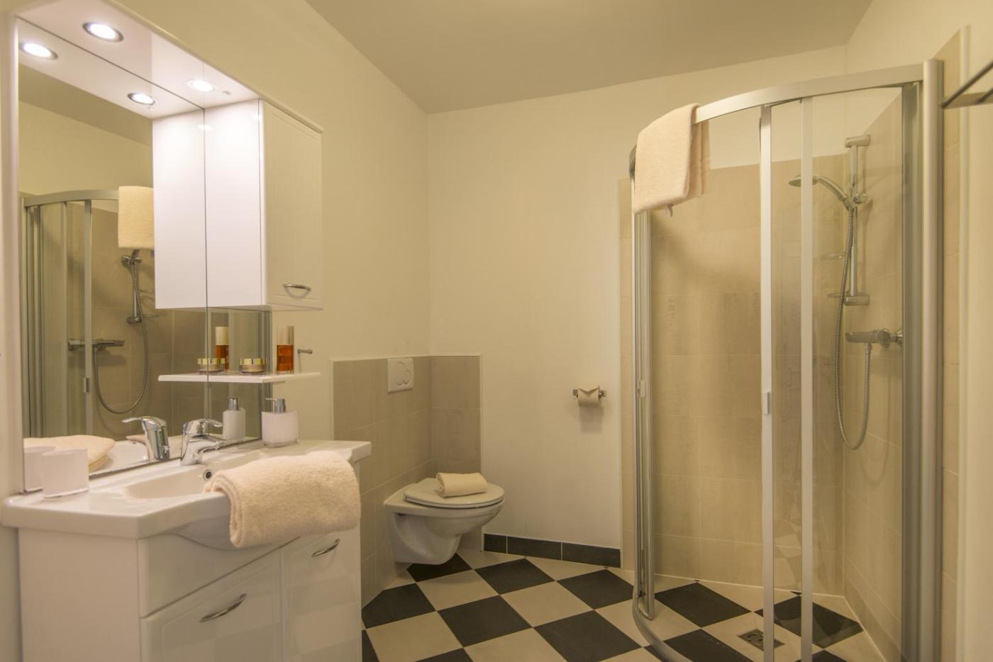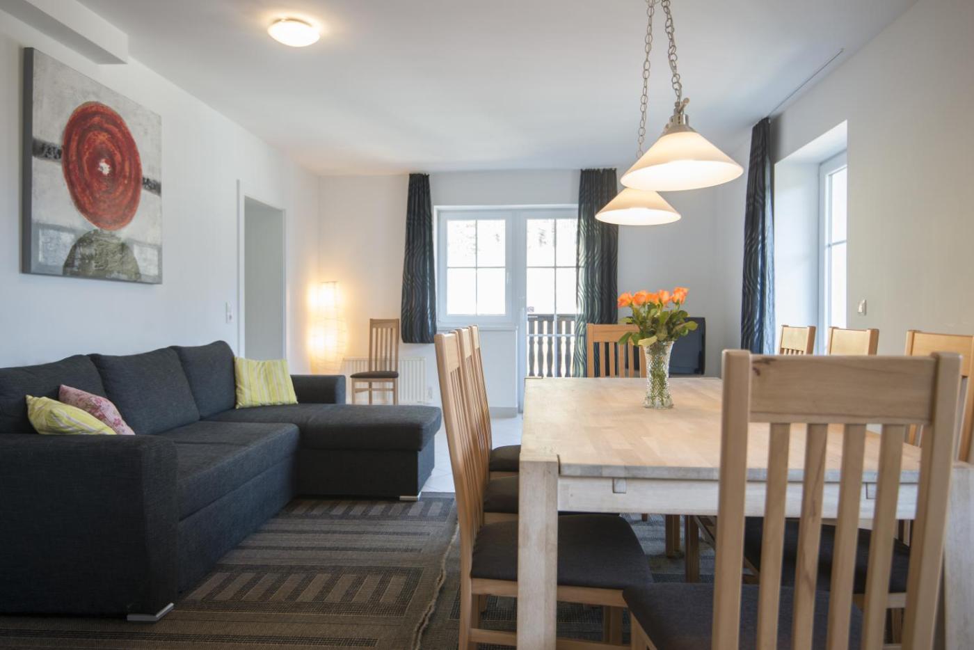 The Alpenhof was renovated in 2009 and its bright apartments feature fresh white walls and light wood flooring and furniture, which combine well with the dark grey sofas and carpets.