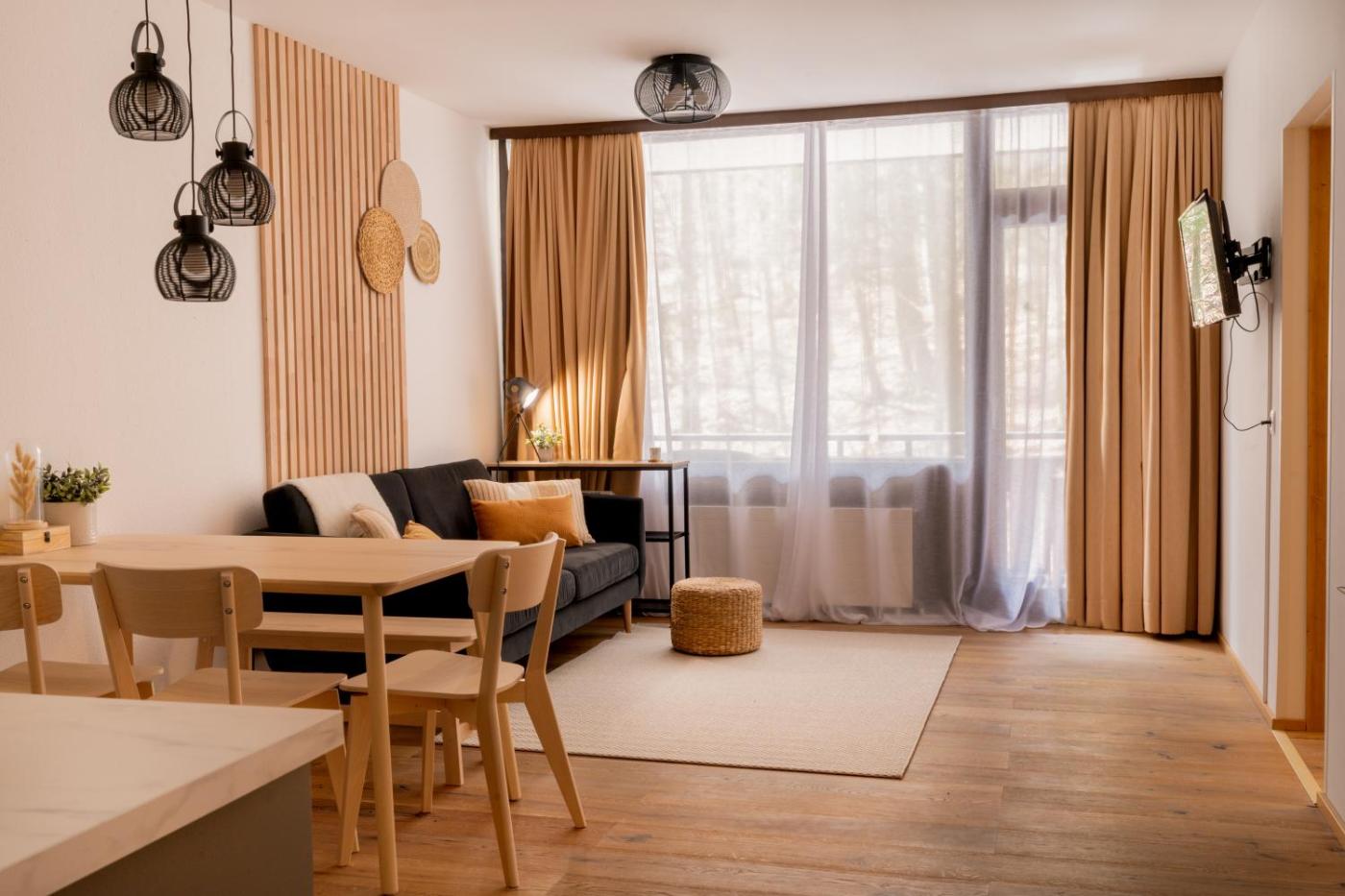 Two-Bedroom Apartment. The private pool and sauna are the special features of this apartment. Featuring a private entrance, this apartment also comprises 2 bedrooms, a seating area and 1 bathroom with a bath and a shower. Guests can make meals in the kitchen that comes with a stovetop, a refrigerator, a dishwasher and kitchenware. Boasting a balcony with garden views, this apartment also provides a tea and coffee maker and a flat-screen TV with cable channels. The unit offers 4 beds.