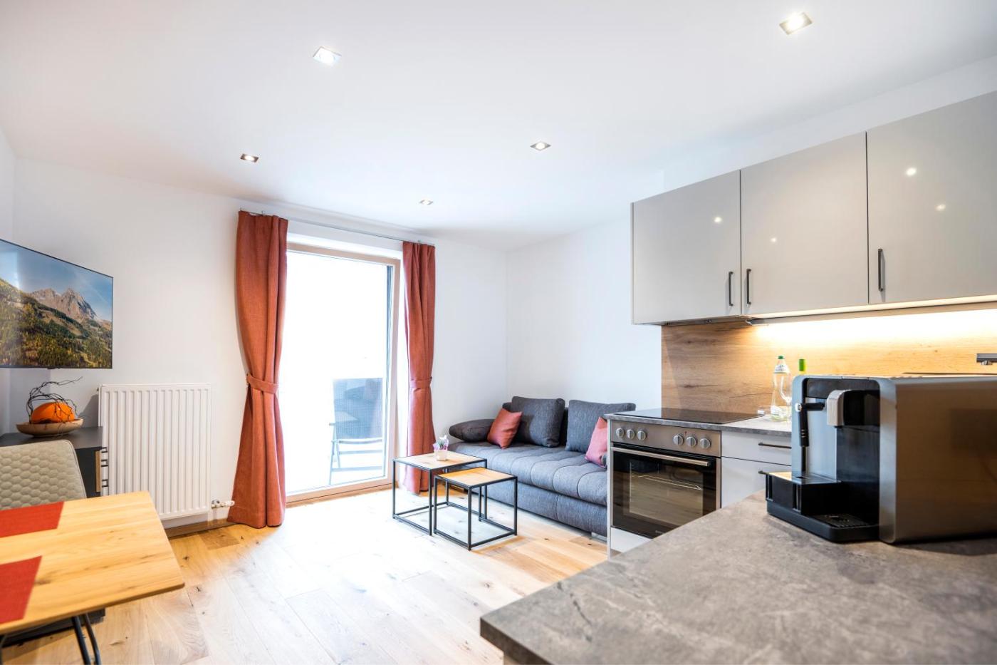 The apartment provides guests with a balcony, mountain views, a seating area, cable flat-screen TV, a fully equipped kitchen with a dishwasher and a toaster, and a private bathroom with shower and a hair dryer. A fridge, a stovetop and kitchenware are also offered, as well as a coffee machine and a kettle. At the apartment complex, units are fitted with bed linen and towels.