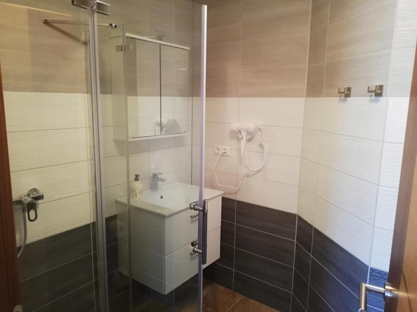 Quadruple Room with Shower. The quadruple room has a private bathroom fitted with a walk-in shower and a hairdryer. The quadruple room offers soundproof walls, a wardrobe, a tiled floor, a flat-screen TV with streaming services, as well as mountain views. The unit has 2 beds. ;