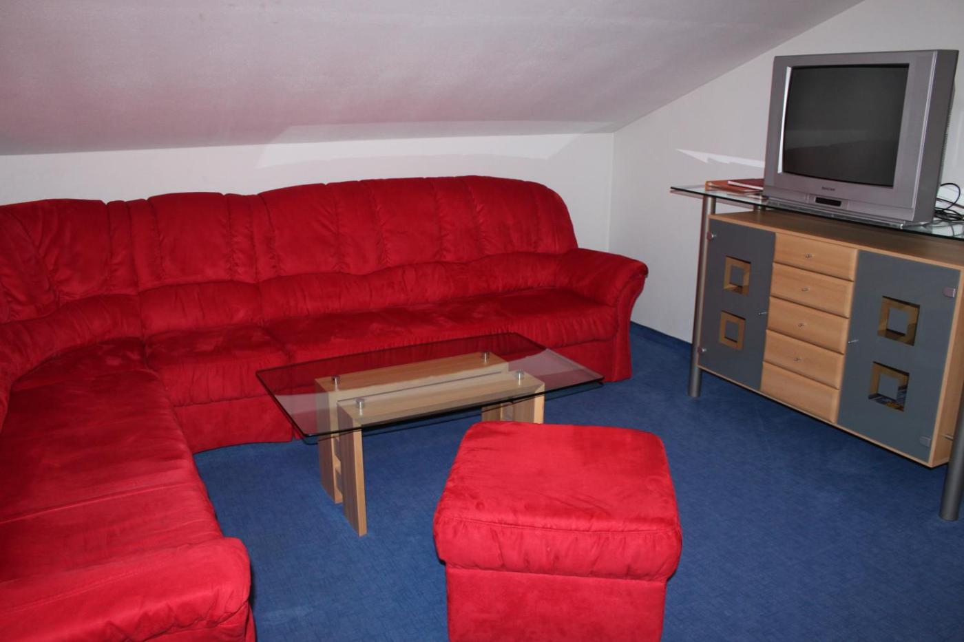 Two-Bedroom Apartment (4-6 Adults). This apartment has a balcony, a bedroom with double bed, a bedroom with single bed, a living room with a sofa bed and satellite TV, a kitchen, dishwasher, a microwave (on request) and a bathroom. A washing machine and ski boot drying facilities are available for use in the basement. Please note that final cleaning fees are not included (see Important Information). ;