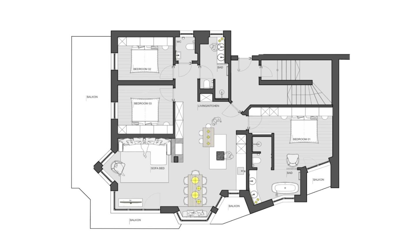 Apartment - Ground Floor. This apartment has a bathtub, smart TV, a Nespresso machine and several Sonos loudspeakers.