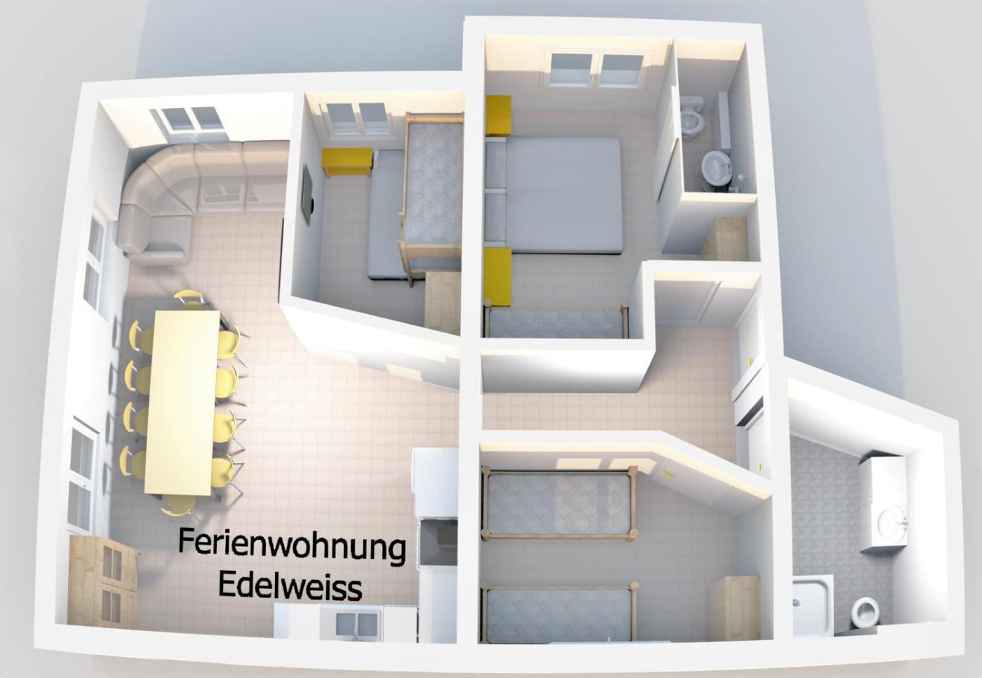 Three-Bedroom Apartment. The lower bed of the bunk bed in one of the bedrooms has a width of 140 cm, while the upper one is 90 cm wide. The sofa bed in the living room has a width of 140 cm. ;