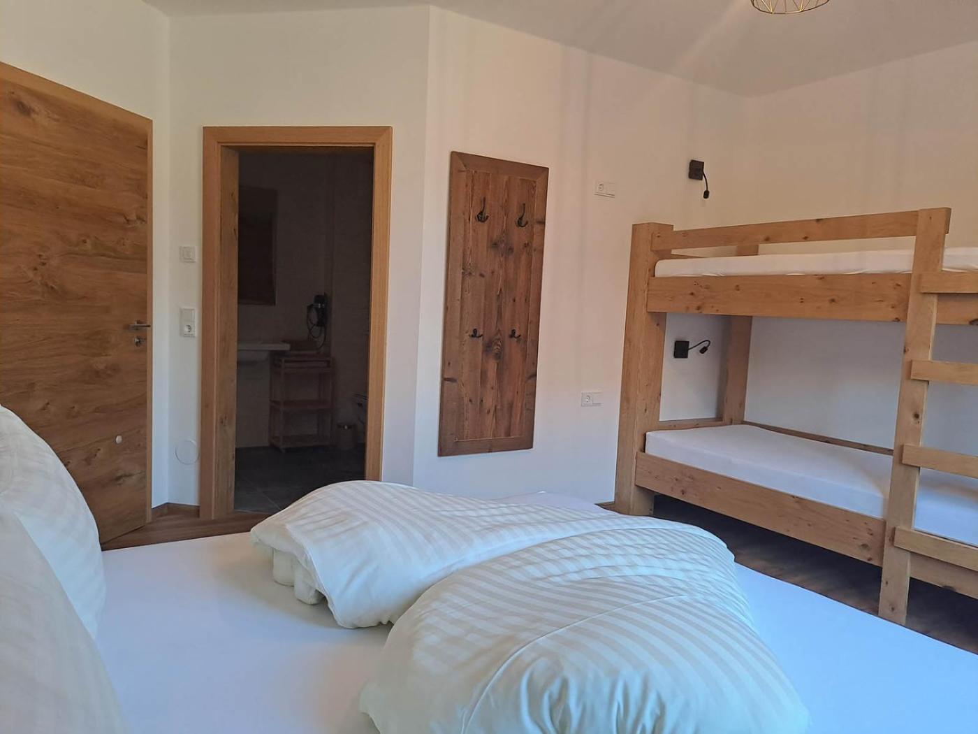Three-Bedroom Apartment. This unit comprises a living room, which connects two bedrooms. Both bedrooms are furnished with Swiss stone pine furniture. There is a small kitchenette, a flat-screen TV, a private bathroom and a balcony on site. ;