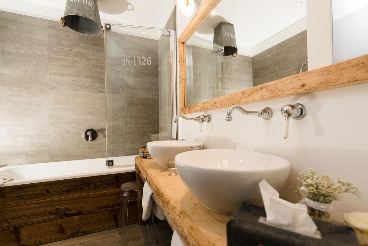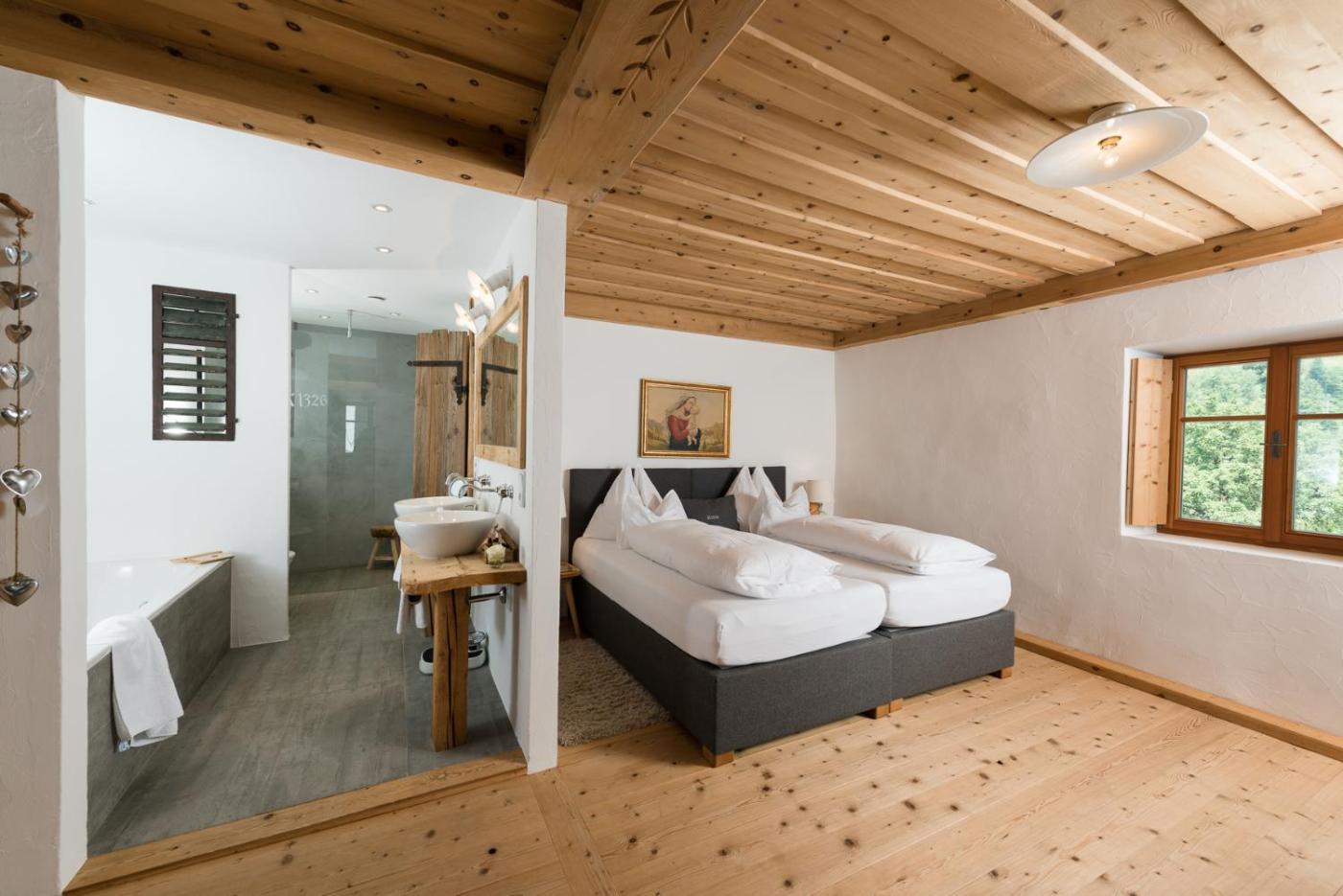 Deluxe Double Room. Providing free toiletries and bathrobes, this double room includes a private bathroom with a bath, a shower and a hairdryer. The double room provides a flat-screen TV with cable channels, a wardrobe, a safe deposit box, parquet floors as well as mountain views. The unit offers 1 bed.