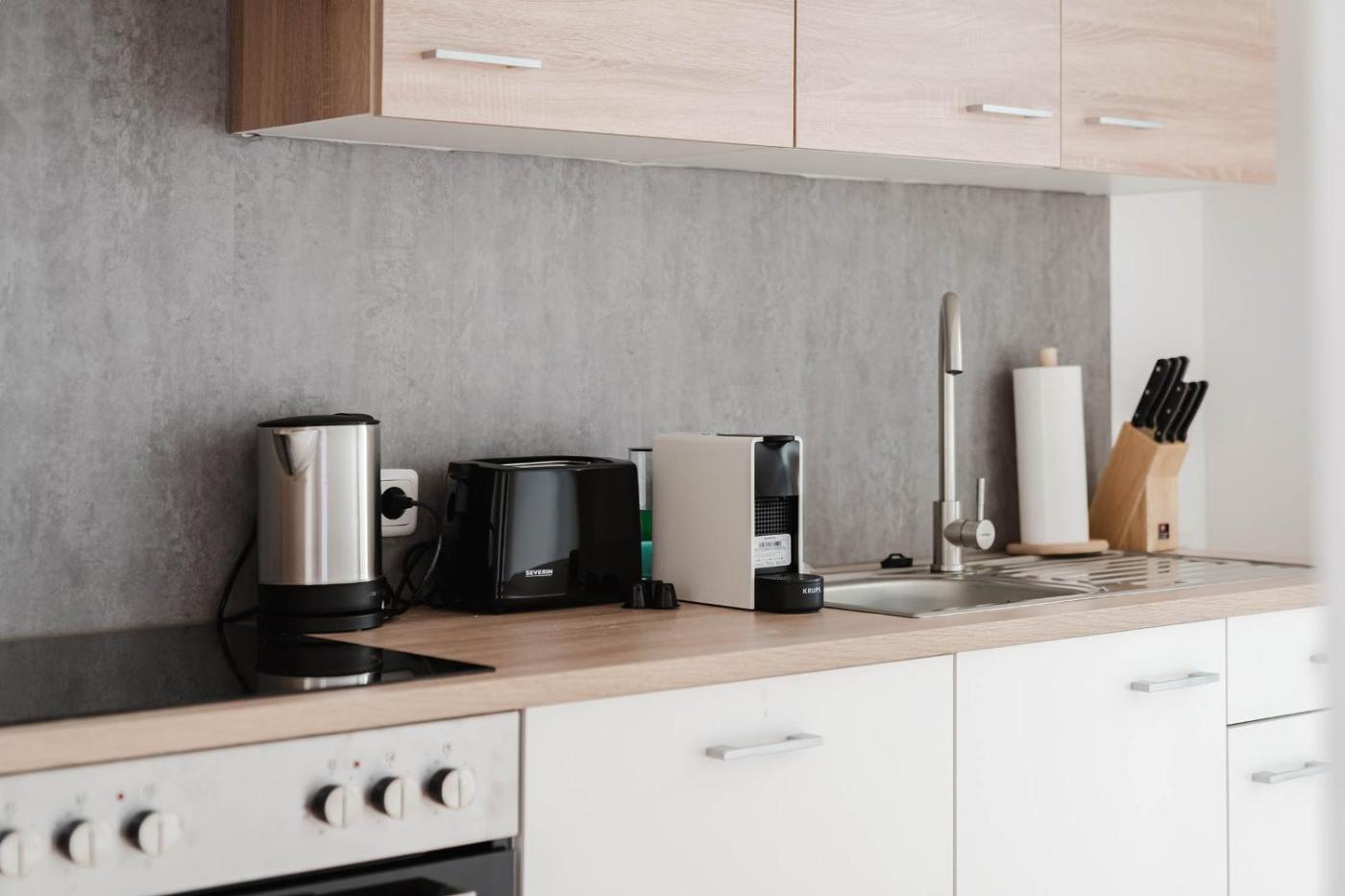 One-Bedroom Apartment. This apartment includes a kitchen, a seating area, 1 separate bedroom and 1 bathroom with a bath and a hairdryer. In the kitchen, guests will find a stovetop, a refrigerator, a dishwasher and an oven. The apartment offers a washing machine, soundproof walls, a tea and coffee maker, a flat-screen TV with streaming services, as well as city views. The unit has 2 beds.