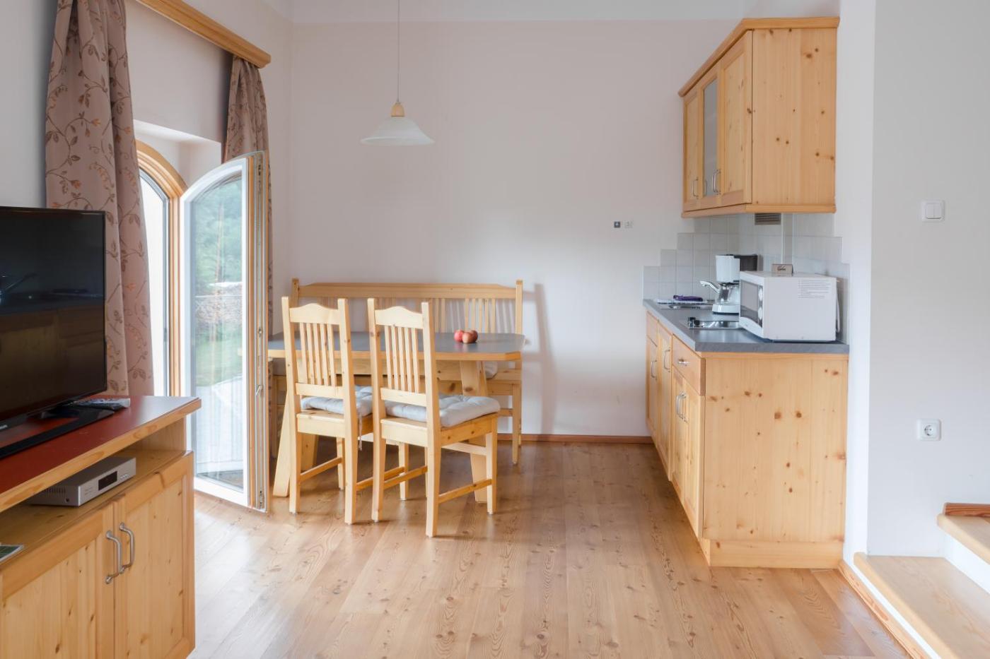 Single Room South Side. The single room provides parquet floors, heating, as well as a private bathroom boasting a bath or a shower and a hairdryer. The fully equipped kitchenette has a refrigerator, kitchenware and a microwave. The single room offers a flat-screen TV with satellite channels, a private entrance, a tea and coffee maker, a wardrobe as well as garden views. The unit has 1 bed. ;