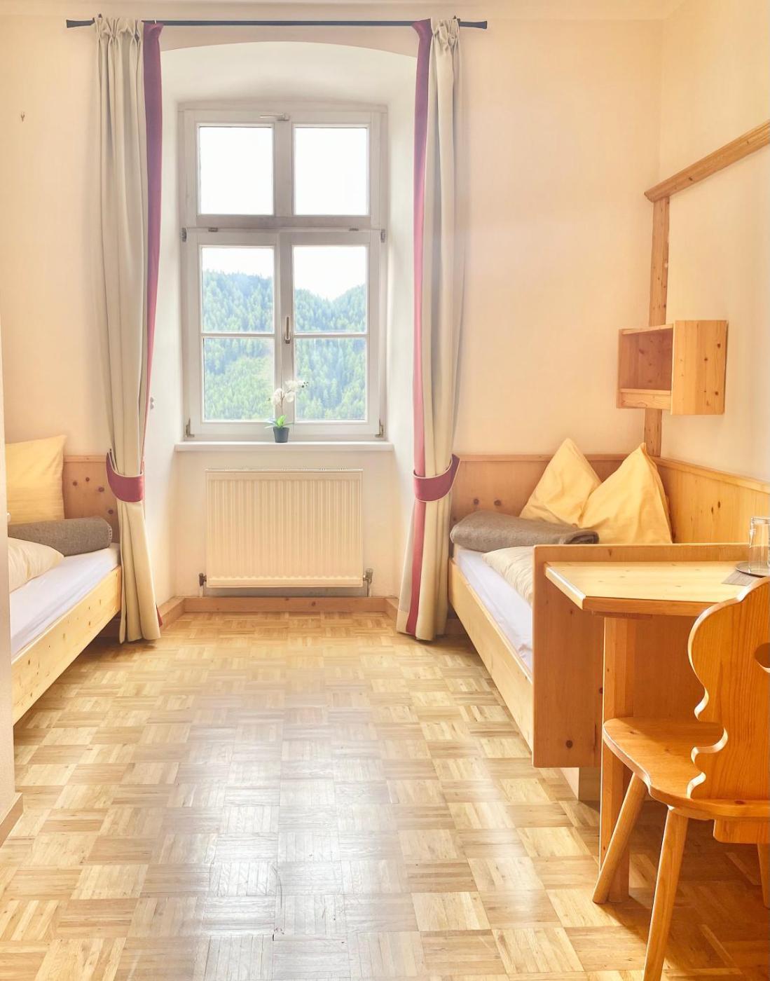 Single Room with Mountain View. Featuring free toiletries, this single room includes a private bathroom with a bath, a shower and a hairdryer. The single room has parquet floors, a seating area with a flat-screen TV, a wardrobe, heating as well as garden views. The unit has 1 bed. ;