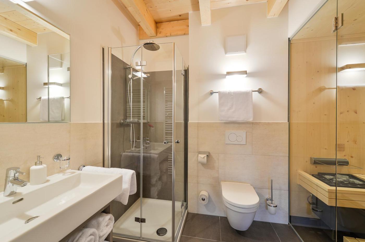 Deluxe Apartment with Sauna 3. Located on the 2nd floor, this modern and bright Alpine-style apartment features a private sauna, a balcony, 2 bedrooms, a living room and a glassed oriel with seating area, 2 bathrooms (1 with shower and 1 with bath tub), a well-appointed open-plan kitchen, wooden floors and a flat-screen TV. ;