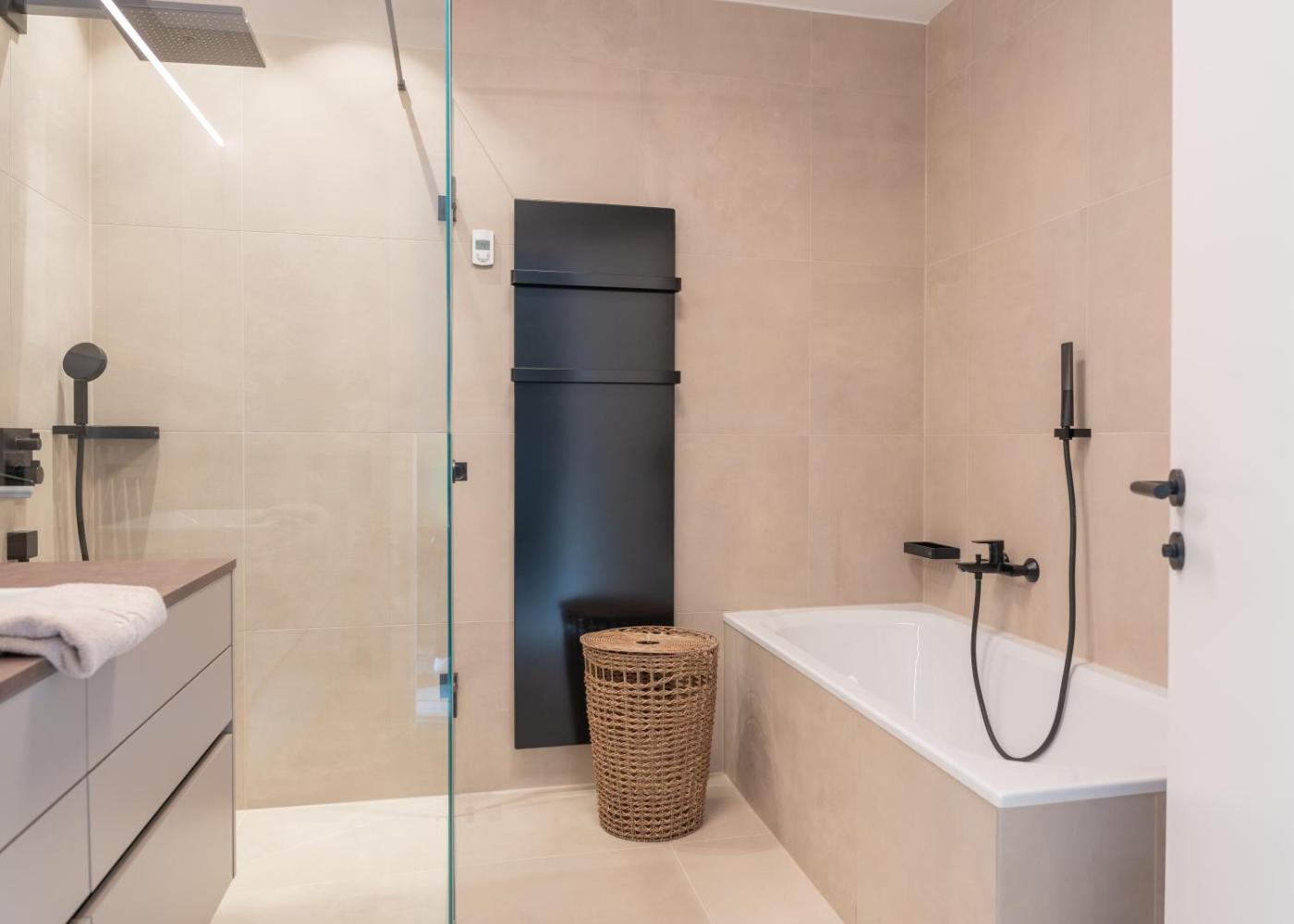 One-Bedroom Apartment. Boasting a private entrance, this apartment comes with 1 living room, 1 separate bedroom and 1 bathroom with a walk-in shower and a hairdryer. The well-equipped kitchen has a stovetop, a refrigerator, a dishwasher and kitchenware. Featuring a terrace with garden views, this apartment also features a washing machine and a flat-screen TV. The unit has 2 beds. ;