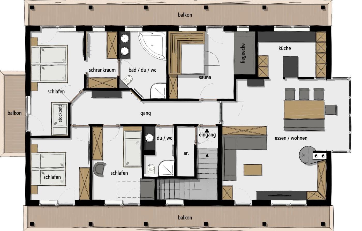 Two-Bedroom Apartment (4 Adults). Apartment with 2 bedrooms, a living room with a sofa bed, a kitchen, 2 bathrooms, an infrared cabin, and a balcony. ;