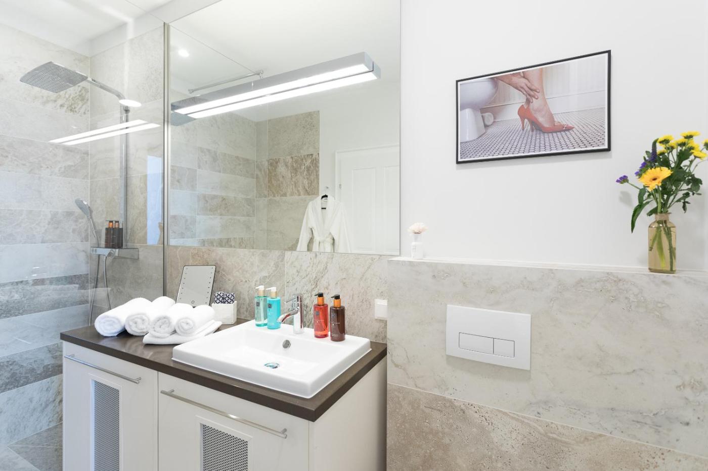 Three-Bedroom Apartment. Featuring 3 bedrooms, this spacious apartment offers 2 bathrooms with a walk-in shower, a seating area and terraceyou can relax. Meals can be prepared in the well-fitted kitchen, which is equipped with a stovetop, a refrigerator, a dishwasher and kitchenware. The air-conditioned apartment provides a flat-screen TV, a washing machine, soundproof walls, a tea and coffee maker as well as city views. The unit has 4 beds. ;