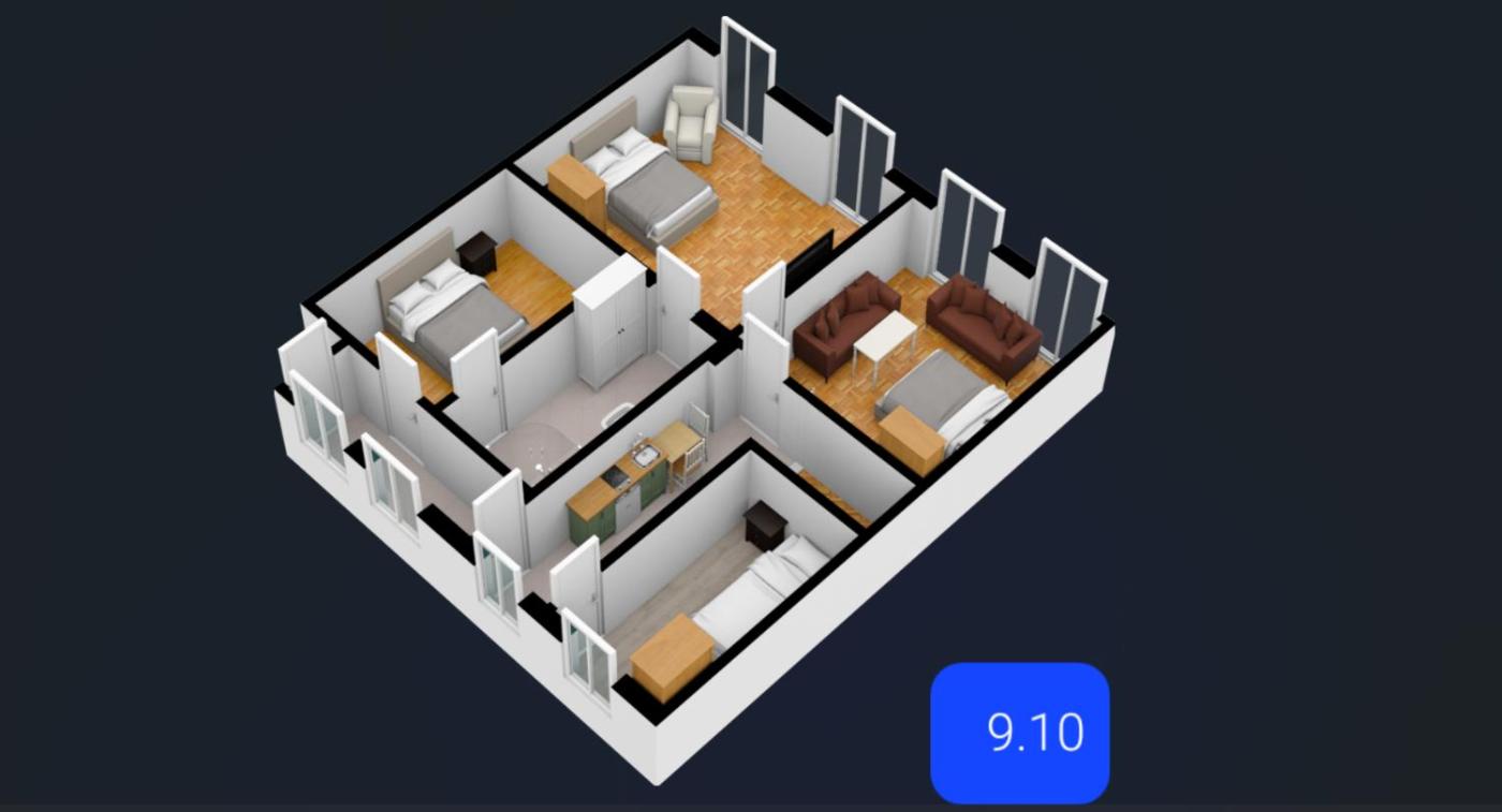 Four-Room Apartment. The apartment features 4 bedrooms, 1 bathroom and a kitchen. The apartments kitchen is available for cooking and storing food. This apartment has a washing machine, heating and a flat-screen TV. The unit offers 6 beds.