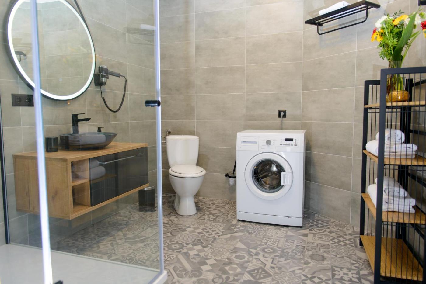 Studio Apartment. Boasting a private entrance, this apartment includes 1 living room, 1 separate bedroom and 1 bathroom with a shower and a hairdryer. In the kitchen, guests will find a stovetop, a refrigerator, kitchenware and a microwave. The apartment offers a washing machine, a tea and coffee maker, a seating area, a flat-screen TV with streaming services, as well as city views. The unit has 2 beds. ;