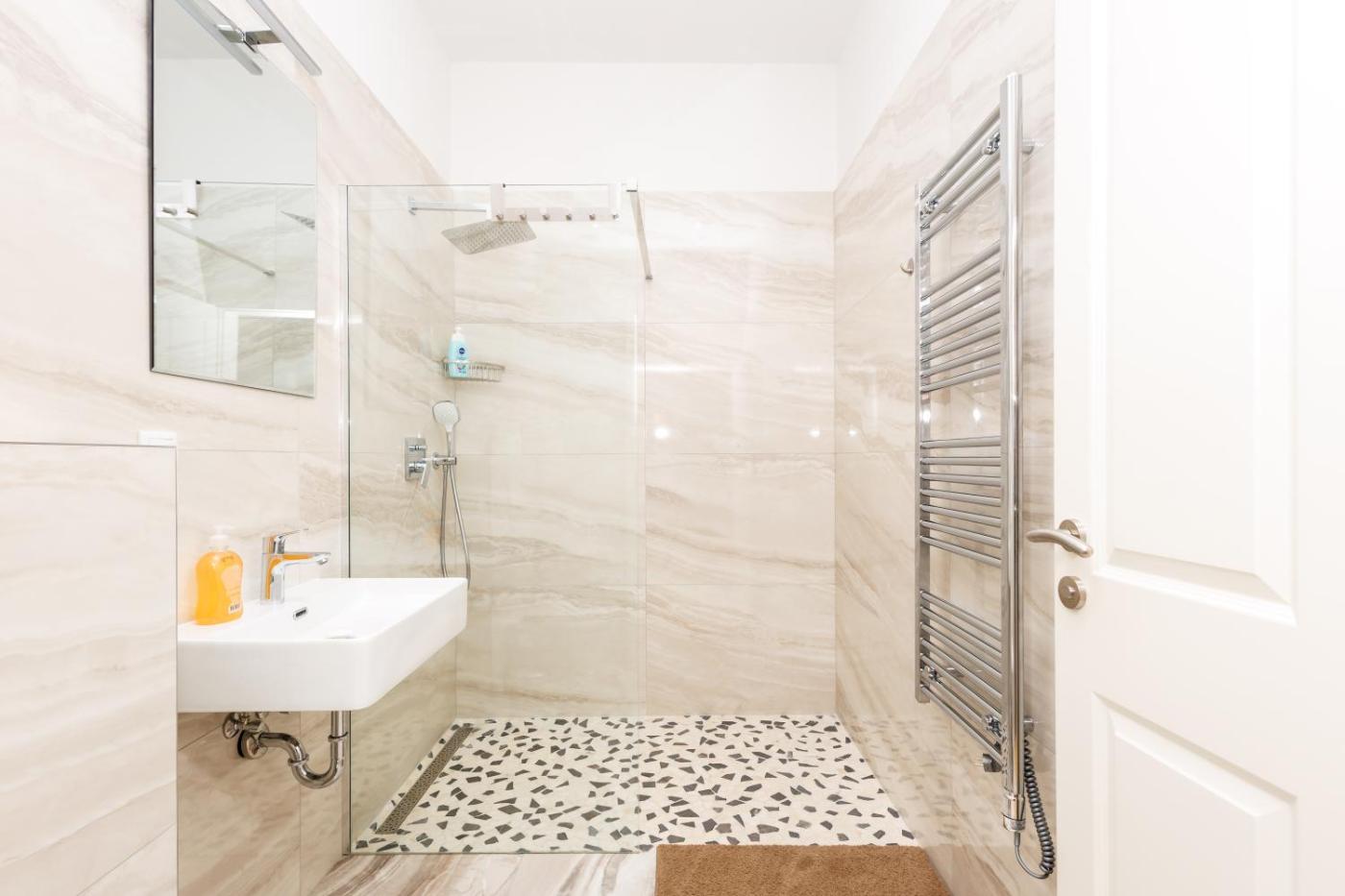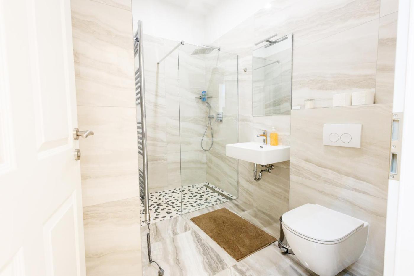 One-Bedroom Apartment. The apartment features 1 bedroom and 1 bathroom with a walk-in shower and free toiletries. Meals can be prepared in the kitchen, which is equipped with a stovetop, a refrigerator, kitchenware and an oven. This apartment has air conditioning, a washing machine, flat-screen TV, as well as chocolate for guests. The unit offers 2 beds.