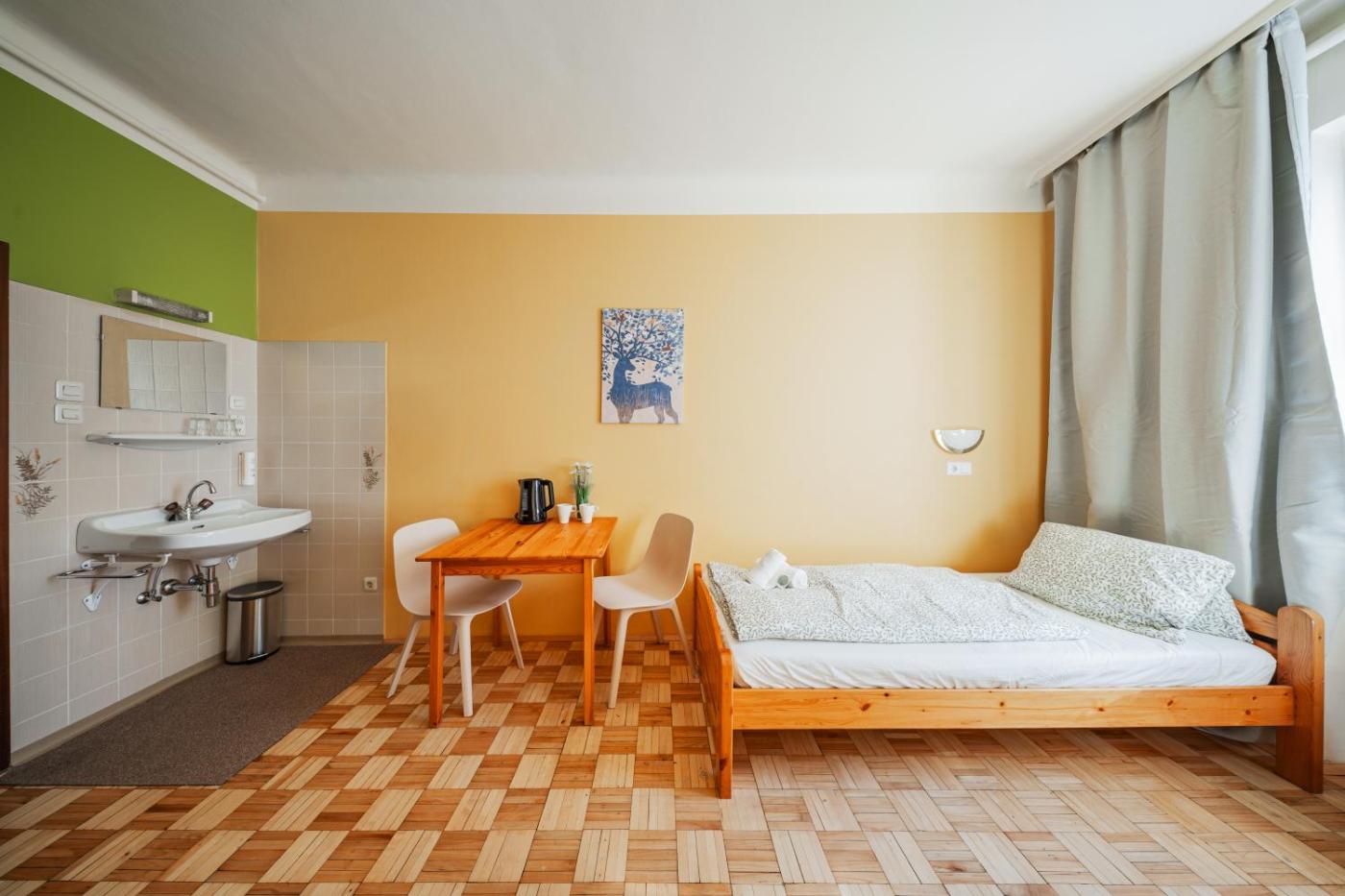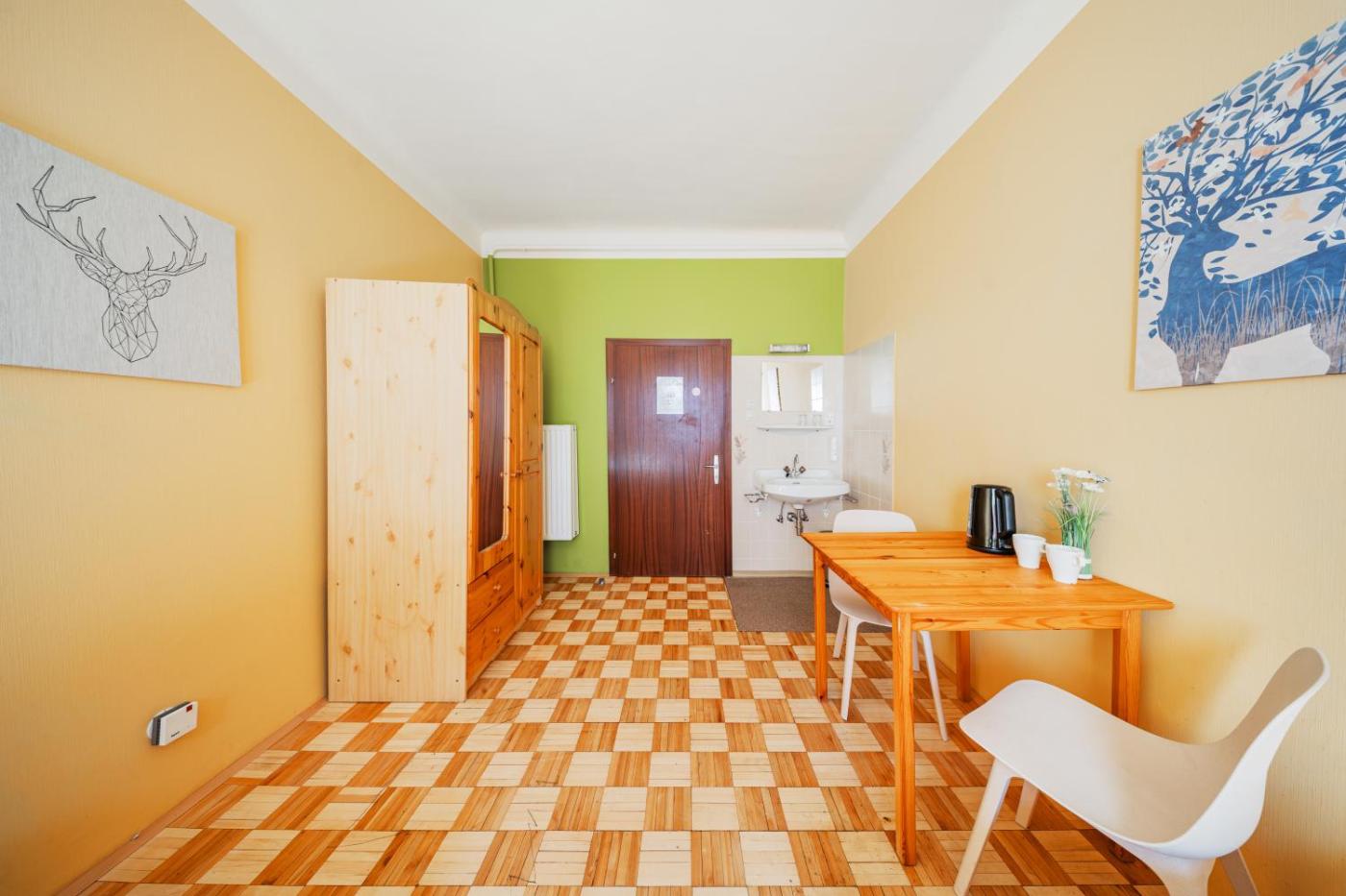 Economy Twin Room. The twin room features a wardrobe, an electric kettle, as well as a shared bathroom boasting a shower and a hairdryer. The twin room offers parquet floors, heating and garden views. The unit has 2 beds.