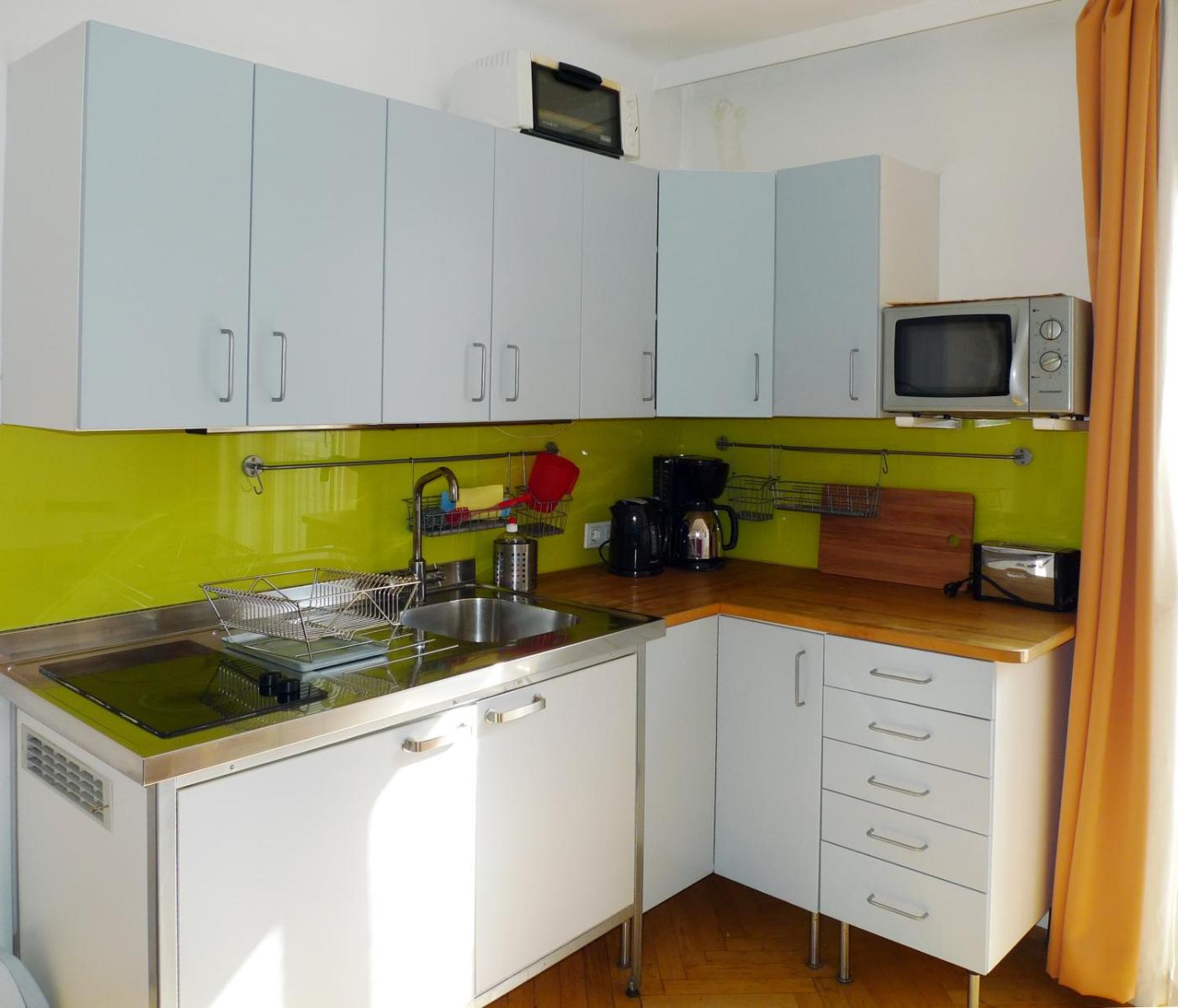 One-Bedroom Apartment. Boasting a private entrance, this air-conditioned apartment includes 1 living room, 1 separate bedroom and 1 bathroom with a shower and a hairdryer. Meals can be prepared in the kitchenette, which is fitted with a stovetop, a refrigerator, kitchenware and a microwave. The apartment has parquet floors, a seating area with a flat-screen TV, a washing machine, a coffee machine, as well as a dining area. The unit has 3 beds.