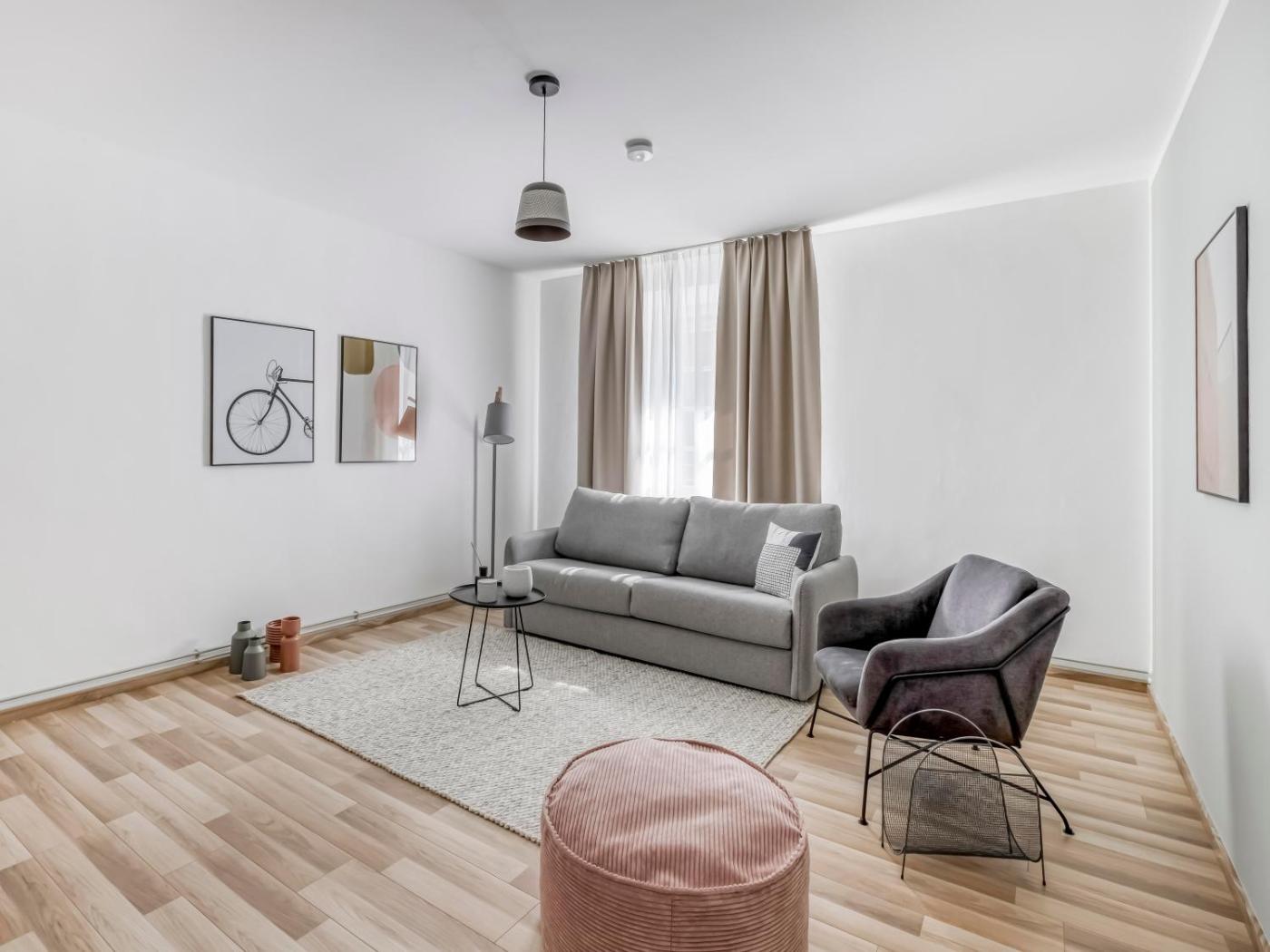 Suite XL with sofa bed. The suite has 1 bedroom and 1 bathroom with a shower and free toiletries. Meals can be prepared in the well-fitted kitchen, which features a stovetop, a refrigerator, kitchenware and a microwave. The suite features a washing machine, a coffee machine, a seating area, a dining area, as well as a flat-screen TV. The unit has 2 beds. ;